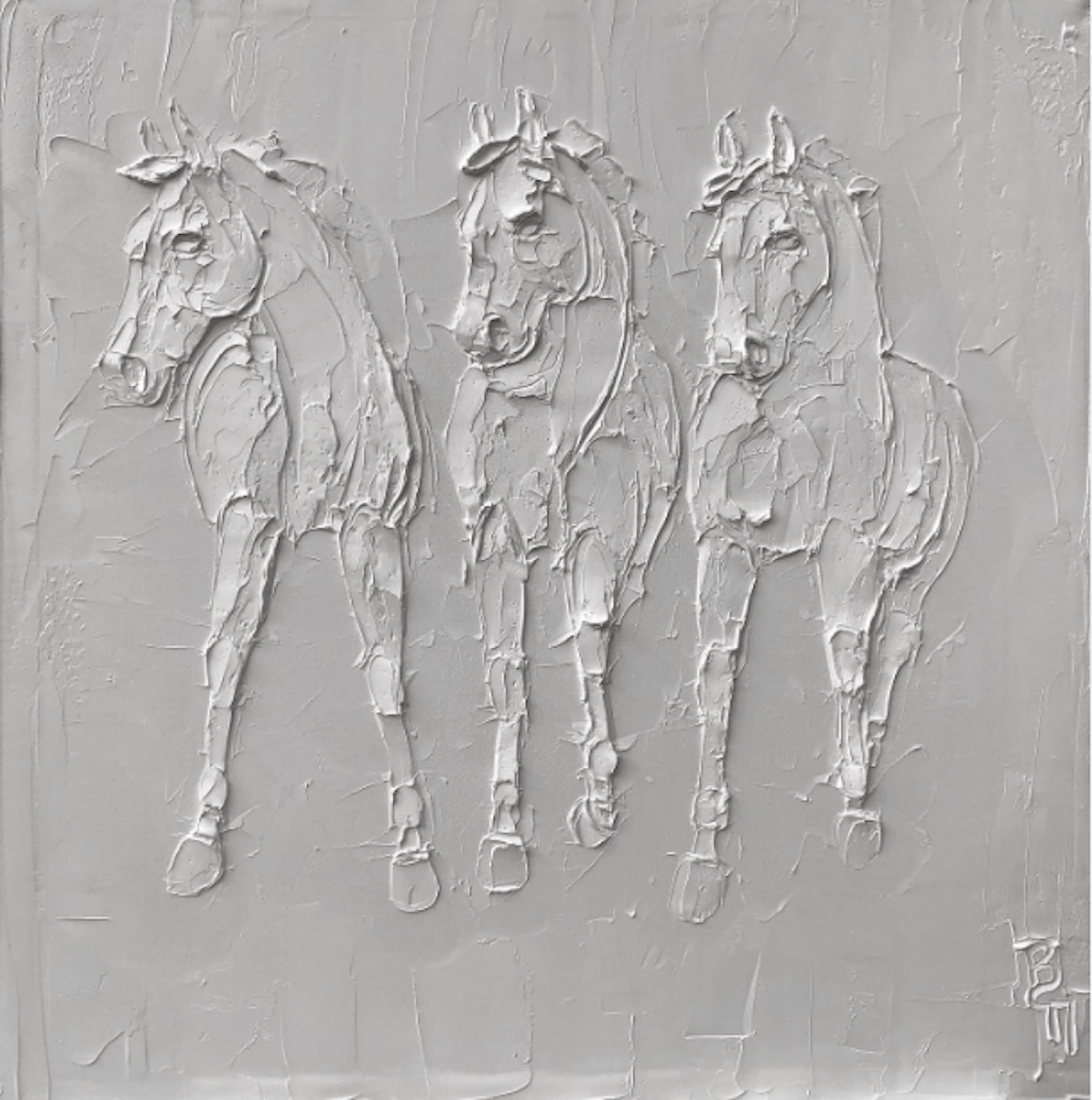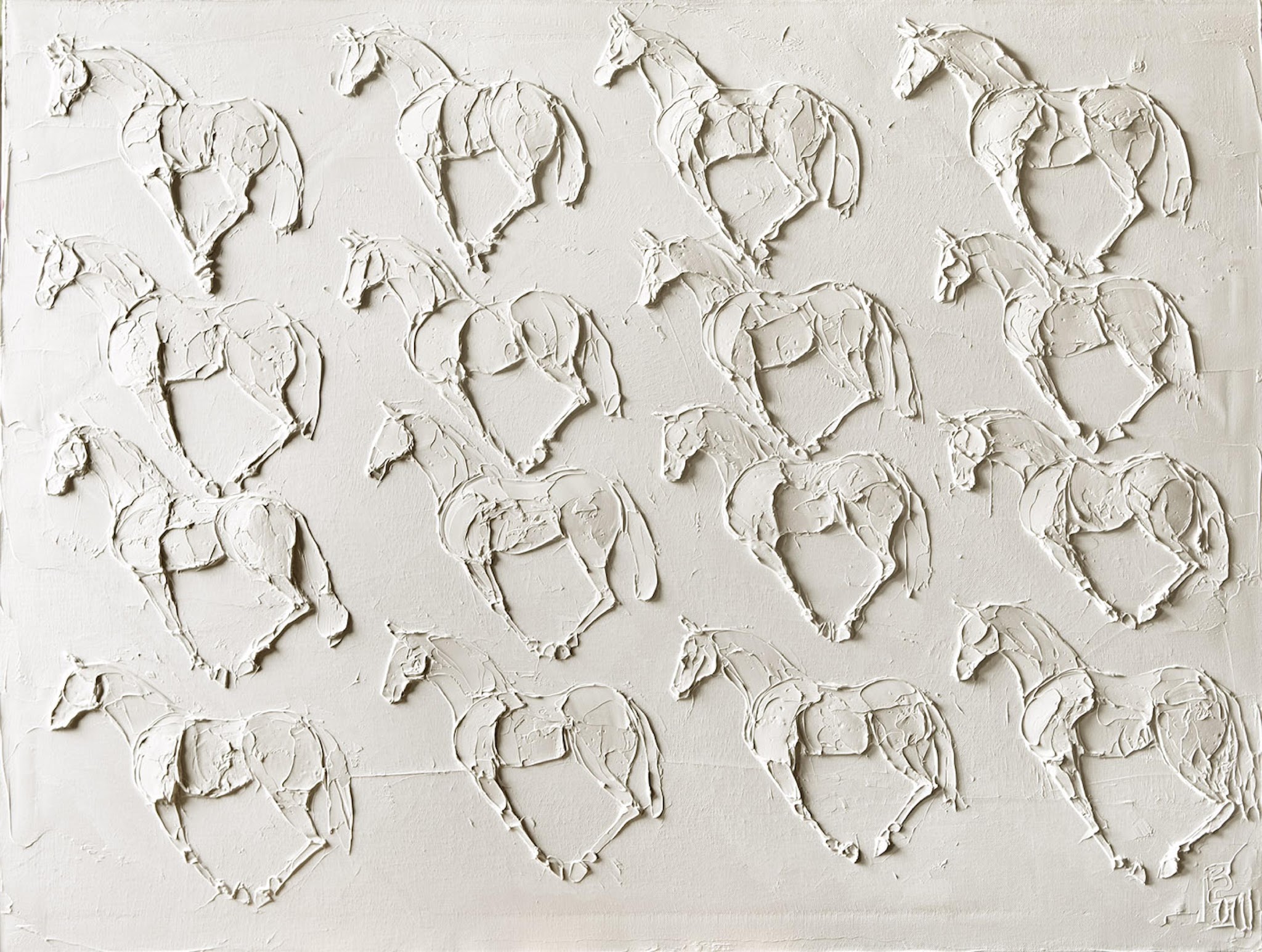 Her life and work are rooted in two lifelong passions — art and horses — which intersect directly in her studio practice. In Normandy, she breeds and trains show-jumping horses that serve as models and inspiration for her paintings.
