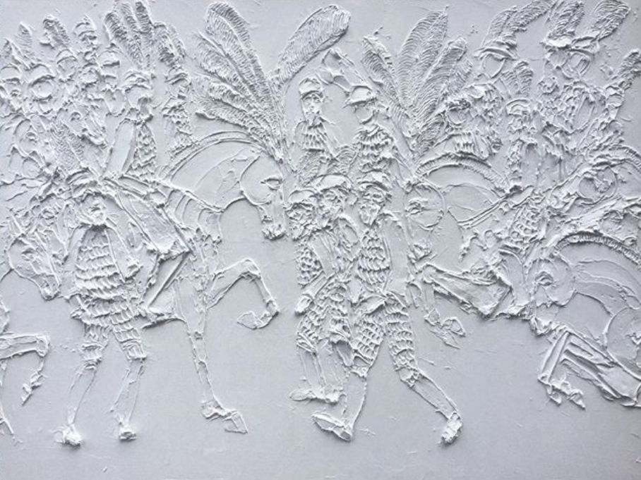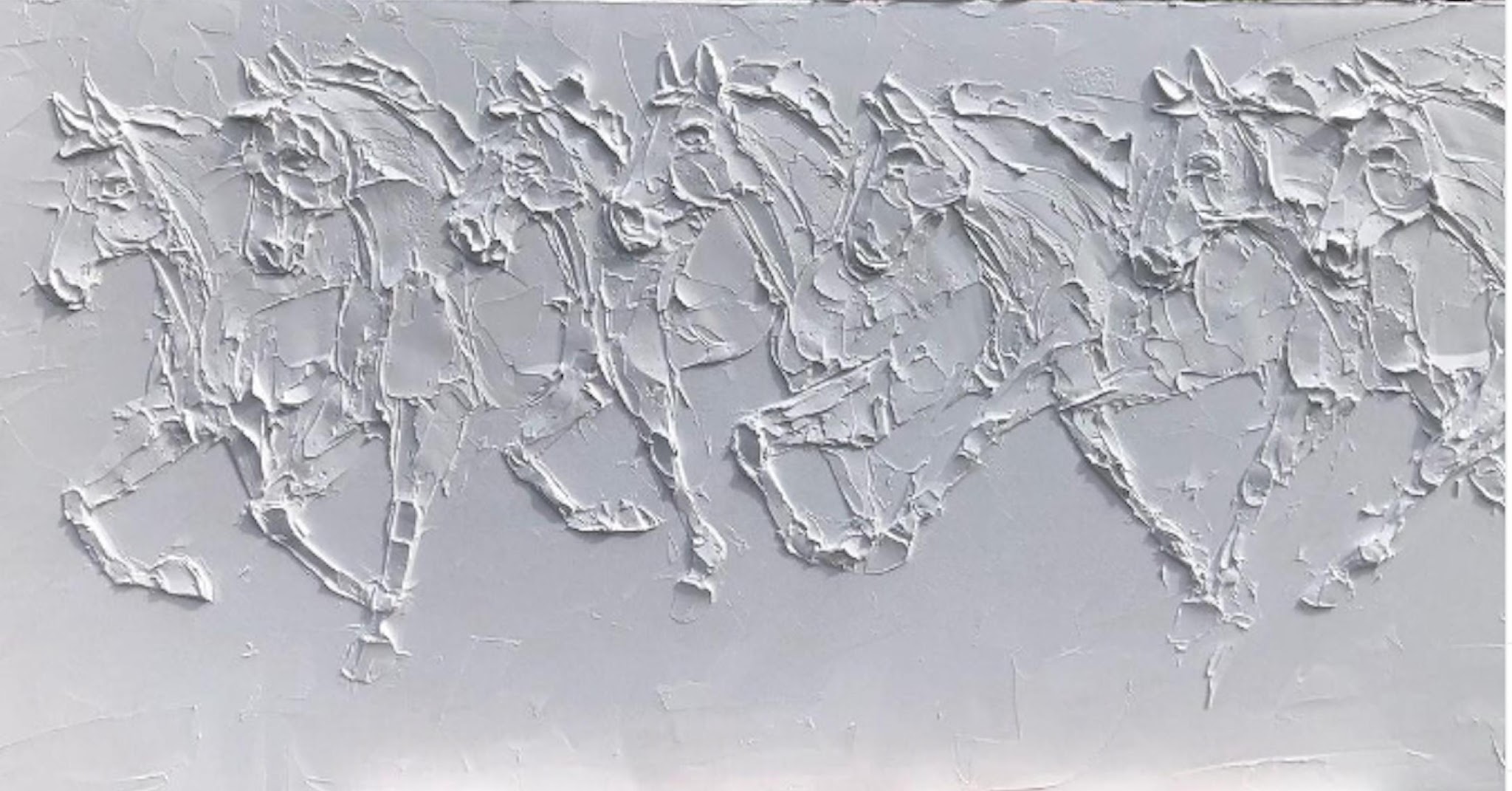 Major is known for her signature monochromatic oil paintings, created exclusively with shades of white and beige. Rather than relying on traditional brushstrokes, she builds thick layers of oil paint using palette knives, sculpting the surface to create three-dimensional textures that interact with light and shadow. This approach challenges the boundaries between painting and sculpture.