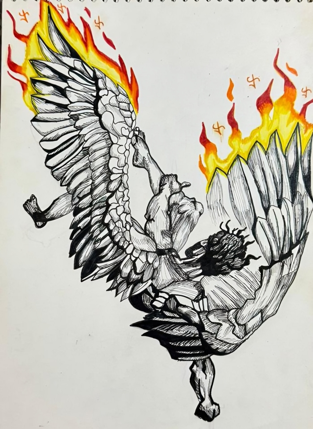 The burning wings symbolize the sacrifice of one’s own identity, yet the peaceful expression suggests a sense of fulfillment, highlighting the paradox of surrendering to love.
