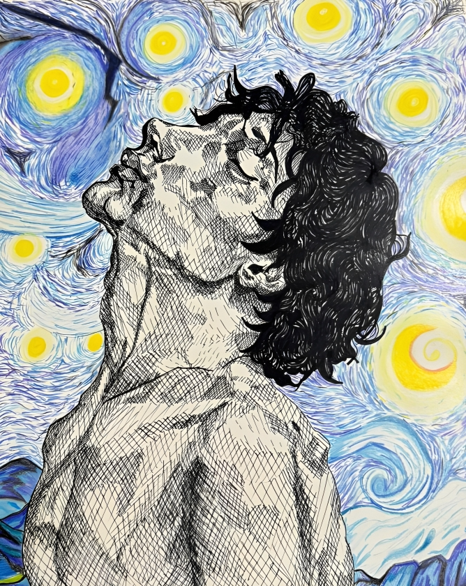 The black and white figure, rendered in hatching, represents the disjointed and broken reality, while the dreamy night sky, inspired by Van Gogh’s ‘Starry Night,’ symbolizes the alluring escape into a world of obsession and infatuation.