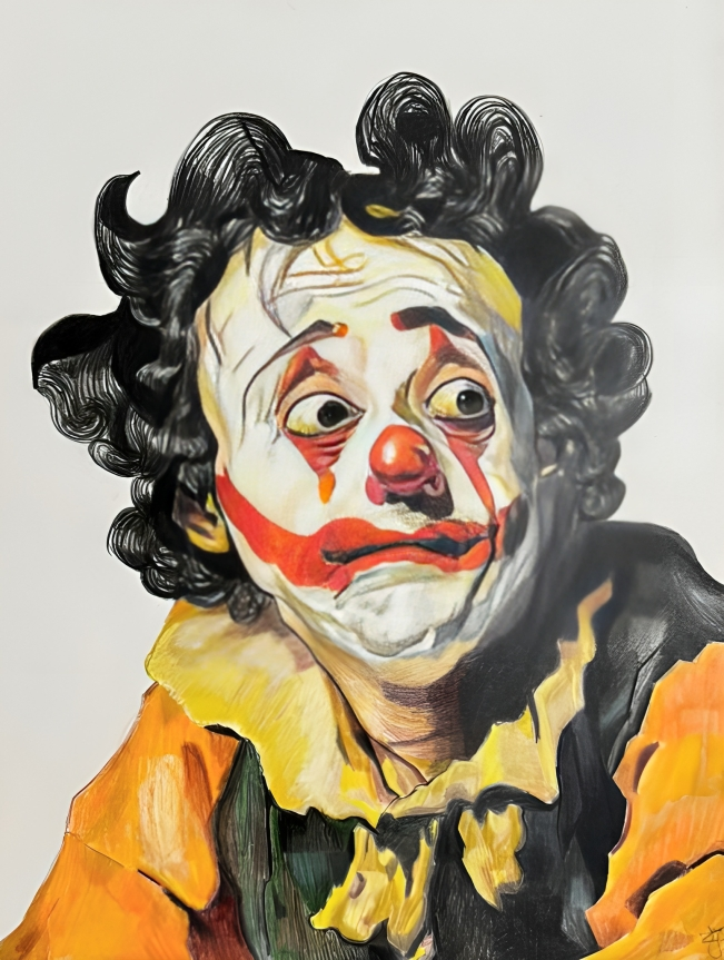 of sadness but never fail to bring joy to others. The contrast of a painted smile with sorrowful eyes reflects the silent battles behind the laughter. A reminder that even the brightest smiles may mask the deepest struggles.