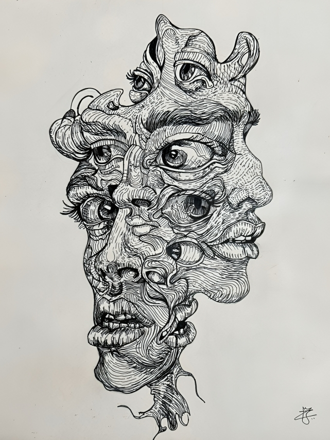 This haunting drawing captures the anguish of anxiety, where the self becomes a labyrinth of conflicting emotions and thoughts. The multiple faces, intertwined and distorted, convey the disorienting sense of being a stranger to oneself.