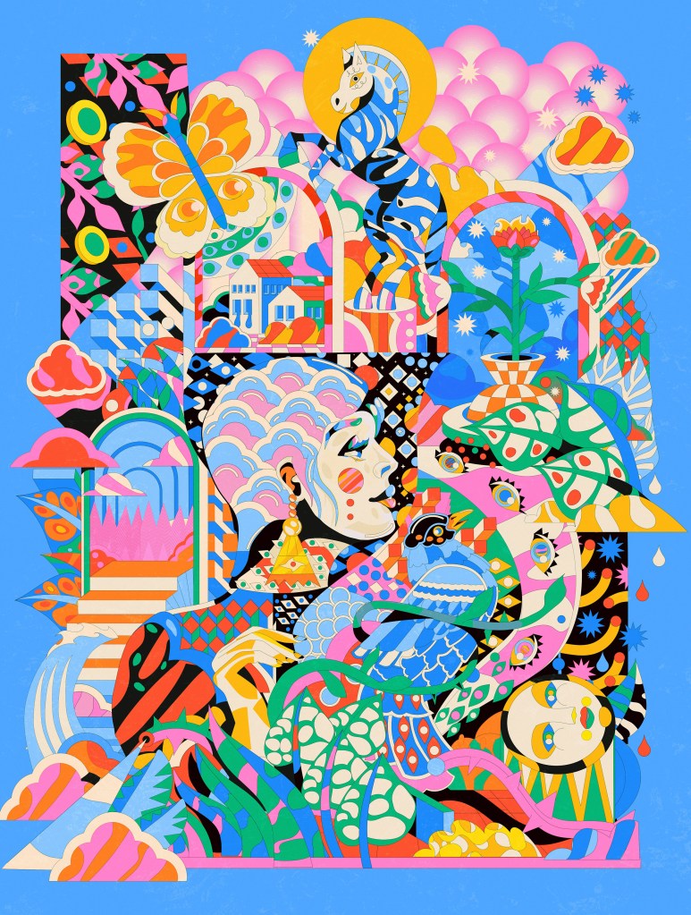 His imagery is informed by classic art movements and contemporary media alike. Influences such as Cubism, geometric abstraction, and psychedelic art coexist with references drawn from pop culture, film, and music. This combination produces a visual language that shifts between order and distortion, precision and surrealism. As Yoaz describes his approach, it spans “from the precision of geometric design and Cubist patterns to the surrealism and vibrancy of psychedelic art.”
